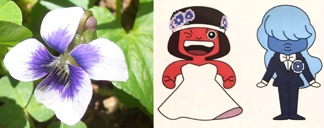 Ruby and Sapphire seem to be wearing violets. These flowers symbolize Sapphic love, romantic love between two women. You can argue the semantics of “genderless space rocks” all day, but I’m going to appreciate the gay little details.